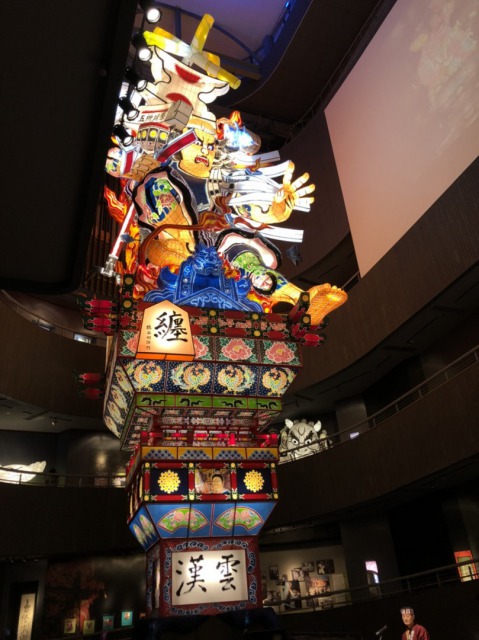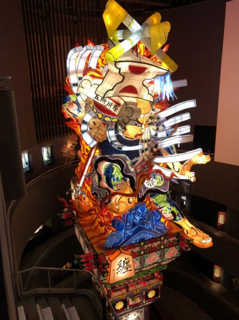 2020年はコロナで中止になってしまったが、たちねぷた をいつでも見れる展示室があった。中には実際に使われている立佞武多(たちねぷた)が3体、どれもデザインが違い、優美な光を放っていた。