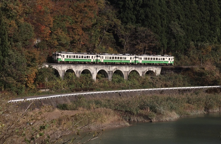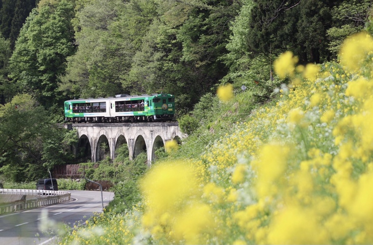 会津坂下インター付近より国道49号から分かれる国道252号を只見・魚沼方面へひたすら進み、早戸駅を過ぎ只見線を跨いで線路が右側に見えた辺りに歌う道路があります。この道路は奥会津シンフォニーロードと呼ばれ、特殊な凸凹加工が施されており車が通過すると『カントリーロード』が流れます。更にその先には右側只見線の線路が特徴的な橋梁、通称めがね橋を通過します。この特徴的なめがね橋を行く列車を、菜の花、新緑、紅葉、雪景色と四季折々の風景を入れて撮影できるのが魅力的で、多くの写真愛好家が訪れています。