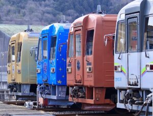 やはり スタートレイン のデビューでしょうか。 夢やすらぎ の『茜色』 アートトレイン の『金色』 スタートレイン の『青色』車庫内が一気に華やかになりました。