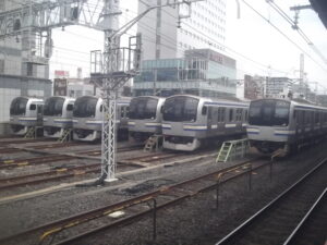 総武線錦糸町駅の総武線快速ホーム横に錦糸町電留線があり、総武線快速電車の6本並びが見られます。