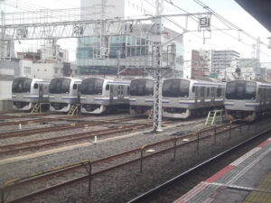 総武線錦糸町駅の総武線快速ホーム横に錦糸町電留線があり、総武線快速電車の6本並びが見られます。